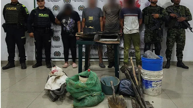 De esta forma se logró la captura en flagrancia de cuatro personas de diferentes edades, quienes presuntamente se encontraban realizando explotación ilícita de oro, generando graves afectaciones ambientales en esta parte del departamento.
